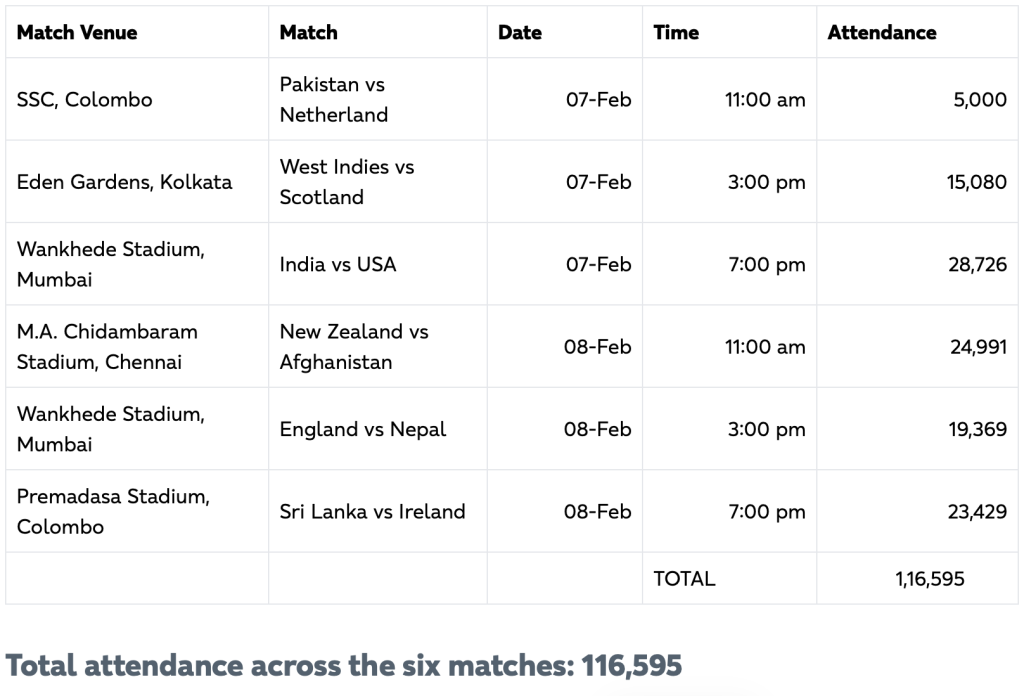India’s victory over the USA at Mumbai’s Wankhede Stadium saw the highest attendance over the weekend with 24,997, with four of the five other matches seeing more than 15,000 people through the gates.