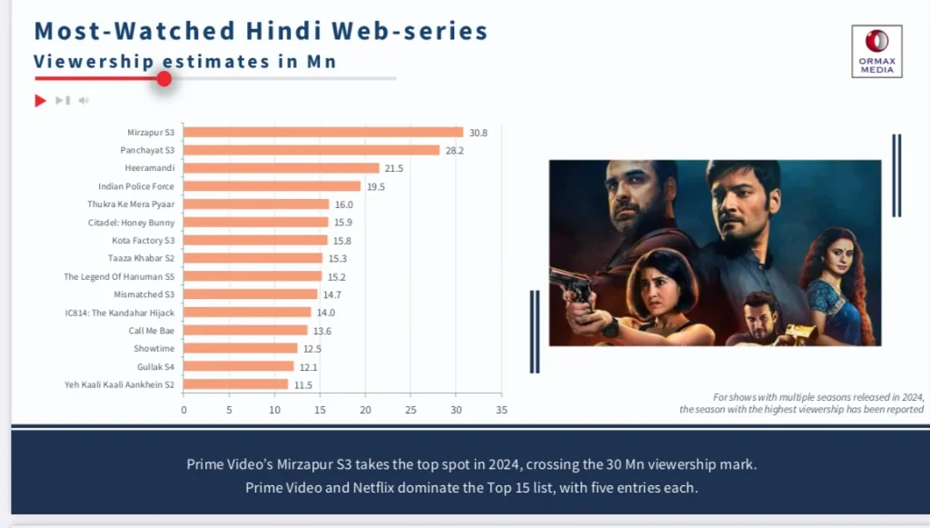 ‘Mirzapur’ S3, ‘Panchayat’ S3 and ‘Heeramandi’ were the top three most viewed Hindi web series of 2024 in India with viewership of 30.8 million, 28.2 million and 21.5 million, respectively, while ‘Squid Game’ second season (19.6 million) was the most watched international show, according to an Ormax Media report.