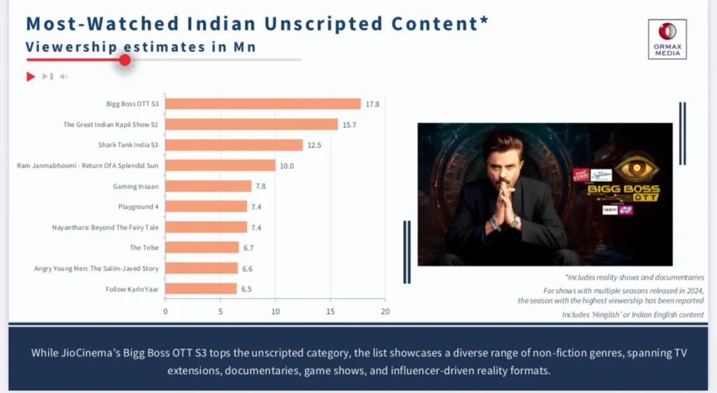 According to the report, ‘Big Boss OTT’ S3, ‘The Great Indian Kapil Show’ season one and ‘Shark Tank India’ S3 were the most-watched shows in the Indian Unscripted Content category with viewership of 17.8 million, 15.7 million and 12.5 million, respectively.