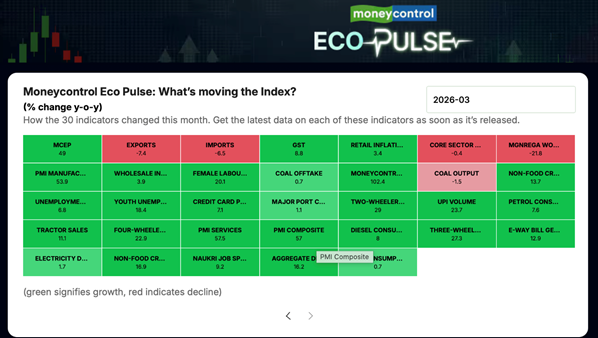 India’s economic activity saw a noticeable slowdown in March, with the Moneycontrol Eco Pulse Index slipping to 49 from 51.4 in February, indicating a contraction in overall momentum. The decline reflects the early impact of geopolitical tensions in West Asia, which have begun to weigh on manufacturing output, infrastructure activity, and external trade.