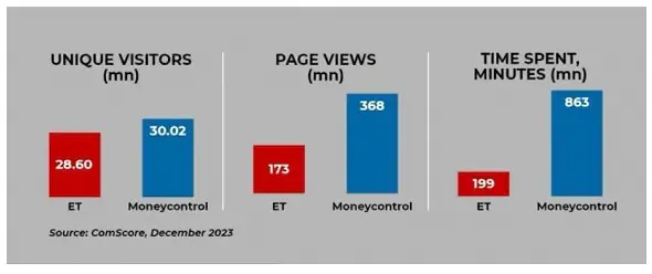 In terms of time spent, Moneycontrol readers dedicated a whopping 863 million minutes to its pages in December, a staggering four times more than the 199 million minutes spent on ET. This unequivocal lead in both page views and time spent solidifies Moneycontrol’s standing as the premier destination for business news in India.