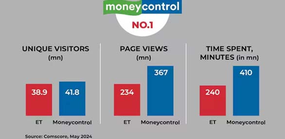 Moneycontrol yesterday said it bolstered its position as India’s top business news platform, beating The Economic Times across key digital metrics, citing Comscore data for May 2024 (India ComScore MMX).