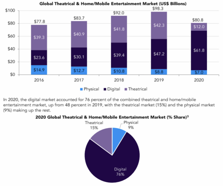 A 72 per cent decrease in the global box office market because of closure of theaters owing to pandemic-related lockdowns was partially offset by a 31 per cent increase in the global digital home/mobile entertainment market, the report stated.
