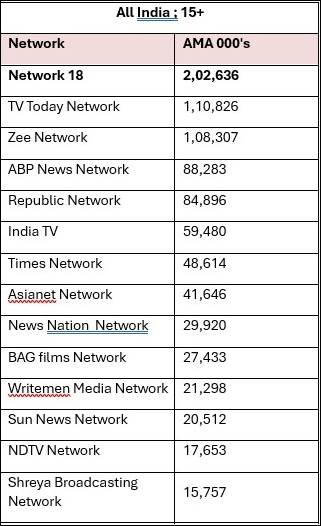Network18 has solidified its position as the leader in India’s news industry, outperforming competitors in the latest BARC ratings. With an unparalleled Average Minute Audience (AMA 000s) of 2,02,636, Network18 has significantly outpaced rivals.