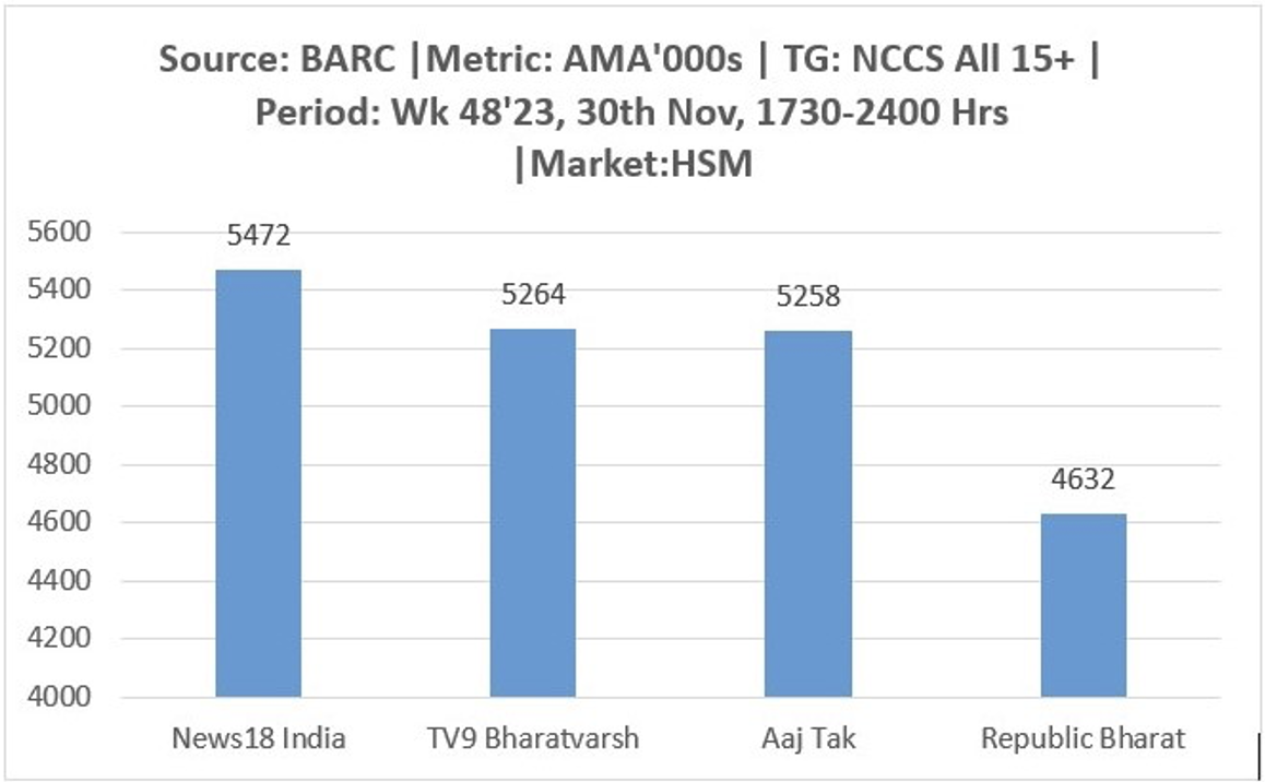 During the crucial hours of the Exit Poll results, a press release from News18 India said, it secured 5,472 AMA’000s, positioning itself as the top choice among viewers for comprehensive Exit Poll coverage. TV9 Bharatvarsh followed closely at 5,264 AMA’000s, trailed by Aaj Tak at 5,258 AMA’000s, and Republic Bharat at 4,632 AMA’000s, among others. (Source: BARC | Metric: AMA’000s | TG: NCCS All 15+ | Period: Wk 48’23, 30th Nov, 1730-2400 Hrs | Market: HSM | 14 channels considered)