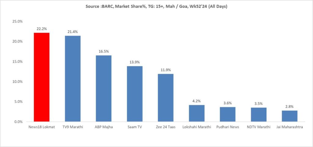News18 Lokmat, a prominent regional channel in the Marathi news genre, has emerged as the leading player in Maharashtra, leaving its closest competitors, TV9 Marathi and ABP Majha, trailing behind. The latest Broadcast Audience Research Council (BARC) ratings solidify its dominance with a market share of 22.2 percent, surpassing TV9 Marathi’s 21.4 percent and ABP Majha’s 16.5 percent.