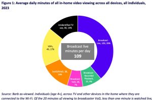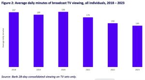 In recent years there has been a radical shift in people’s viewing habits. TV is increasingly being viewed online, driven by the mass take-up of broadband, a range of different devices, new platforms and ways to consume content. The average person spent 25 percent fewer minutes per day watching broadcast TV in 2023 than in 2018, the report said.