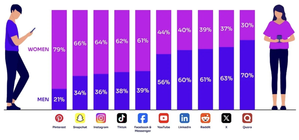 Men, on the other hand, account for the majority of time spent on Quora (70 percent), X (63 percent), Reddit (61 percent), LinkedIn (60 percent) and YouTube (56 percent).