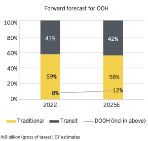 The OOH (out-of-home) media grew 86 percent in 2022 to INR37 billion, the value of which includes traditional, transit and digital media, but excludes untracked unorganized OOH media such as wall paintings, billboards, ambient media, storefronts, proxy advertising, etc., according to a Ficci-EY report.