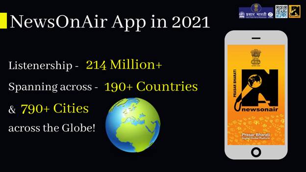 Thanks to increasing popularity in more than 190 countries and 790 cities across the globe, Prasar Bharati’s App NewsOnAir clocked a listenership of 214 million+ in 2021.