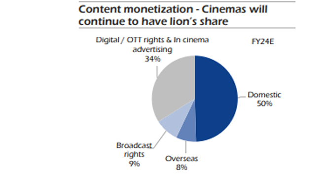 Theatricals accounted for 12.9% of M&E revenues globally in CY19, as per Theme report 2021, largely similar to India’s 10%. Despite the strong growth in the digital segment, domestic theatricals may continue to account for 50% of film revenues in FY24E (as per the EY FICCI report). This shows the importance of this medium in terms of content monetization