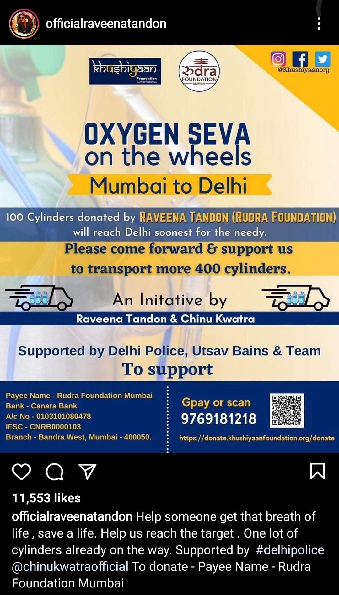 The actress shared a poster on Instagram that showed that Raveena donated the oxygen cylinders to ‘Oxygen Seva on the wheels’ from Mumbai to Delhi that is supported by Delhi Police, Utsab Bains, and team for the needy.
