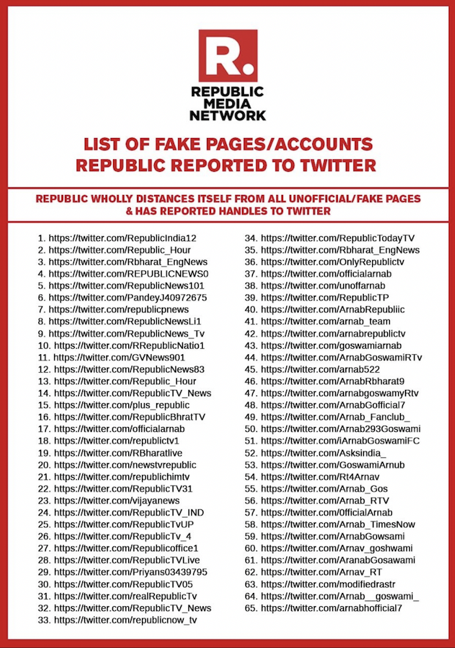Republic Media has also shrugged off any “liability for any content” on these pages impersonating it. The statement was accompanied with a list of 14 fake pages that have been flagged with Facebook and 65 fake Twitter accounts.