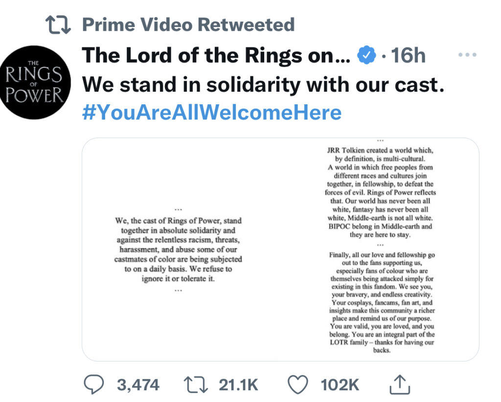 The statement reads: “We, the cast of ‘Rings of Power’, stand together in absolute solidarity and against the relentless racism, threats, harassment, and abuse some of our castmates of color are being subject to on a daily basis.”
