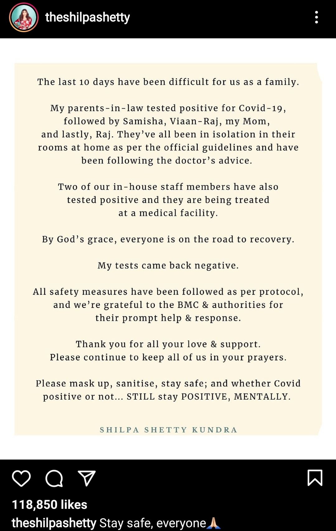 Shilpa took to her Instagram handle and shared a note which read, “The last 10 days have been difficult for us as a family. My parents-in-law tested positive for COVID-19, followed by Samisha, Viaan-Raj, my mom, and lastly, Raj. They’ve all been in isolation in their rooms at home as per the official guidelines and have been following the doctor’s advice. Two of our in-house staff members have also tested positive and they are being treated at a medical facility. By God’s grace, everyone is on the road to recovery. My tests came back negative.”