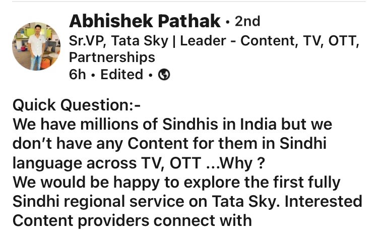 “Quick Question: We have millions of Sindhis in India but we don’t have any Content for them in Sindhi language across TV, OTT…Why ? We would be happy to explore the first fully Sindhi regional service on Tata Sky,” Abhishek Pathak, Senior VP, Tata Sky, said in a LinkedIn post going on to detail a company email ID where content and related proposals could be sent.