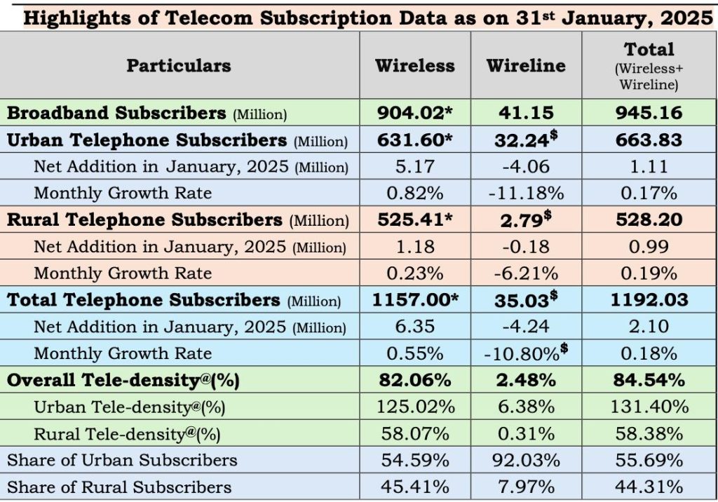 “The number of total telephone subscribers in India increased from 1,189.92 million at the end of December 2024 to 1,192.03 million at the end of January 2025, thereby showing a monthly growth rate of 0.18 per cent,” a PTI report from New Delhi stated quoting Trai data.
