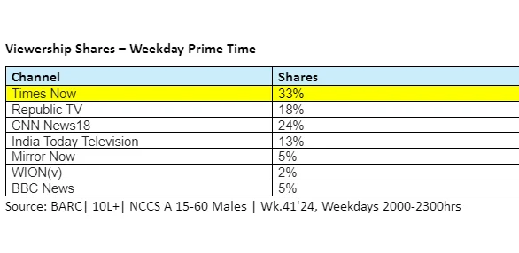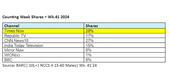 Times Now, India’s premier English news channel, dominated the coverage of the 2024 Jammu & Kashmir and Haryana Assembly elections with a commanding 28 percent market share, reaffirming its position as India’s Election News Headquarters (Source: BARC | 10L+ | NCCS A 15-60 Males | Wk.41’24). Leading with a 33 percent market share during prime-time slots (Weekdays 2000-2300hrs), Times Now’s flagship shows, India Upfront and The Newshour, played a crucial role in its success.