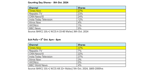 On Counting Day, the channel continued to lead, securing a 27 percent market share, providing viewers with exclusive insights, live updates, and real-time analysis. During the Exit Poll Day broadcast, Times Now emerged as the genre leader, capturing 37 percent viewership share (Source: BARC | 10L+ | NCCS AB 22+ Males | 5th Oct. 2024, 1800-2000hrs).