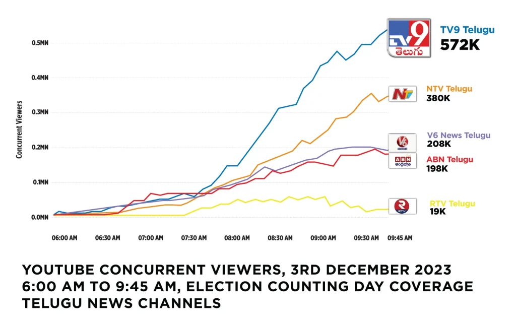 Maintaining its leadership streak, TV9 Telugu broke all records and retained the No. 1 position on YouTube with an unprecedented 570K+ concurrent viewership during the first few hours of December 3 election result coverage.