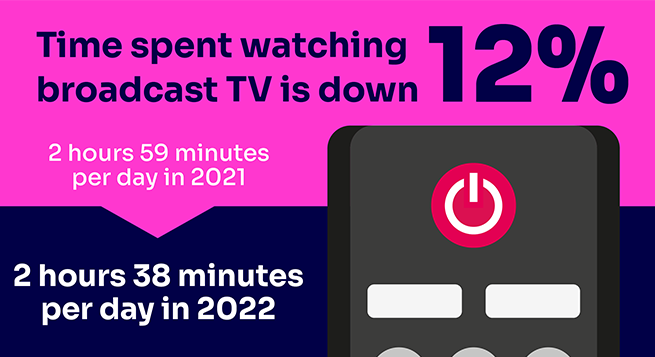 For the first time, there is also evidence of a significant decline in average daily broadcast TV viewing among ‘core’ older audiences (aged 65+), a drop of 8 percent year on year, and down 6 percent on pre-pandemic levels.