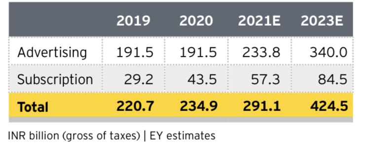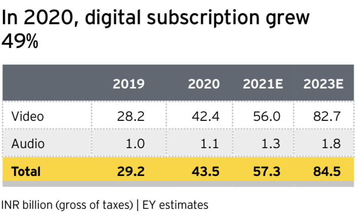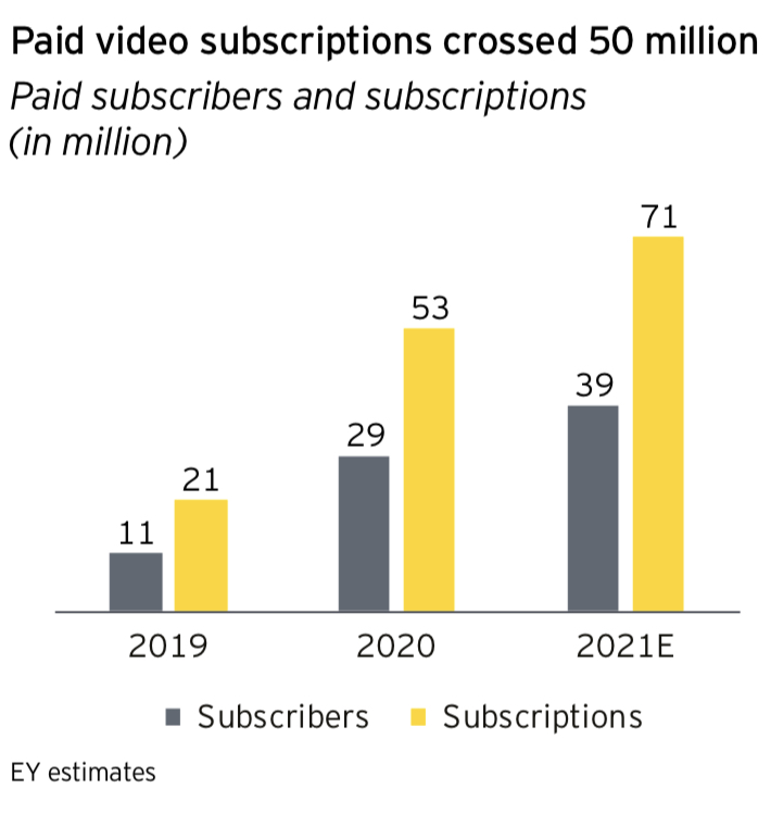 The report stated 29 million subscribers paid for 53 million OTT video subscriptions in 2020 (not counting subscriptions bundled along with data plans) where the key drivers for growth included Hotstar putting the IPL behind a paywall, release of direct to digital movies during the pandemic and lack of fresh content on television for four months.