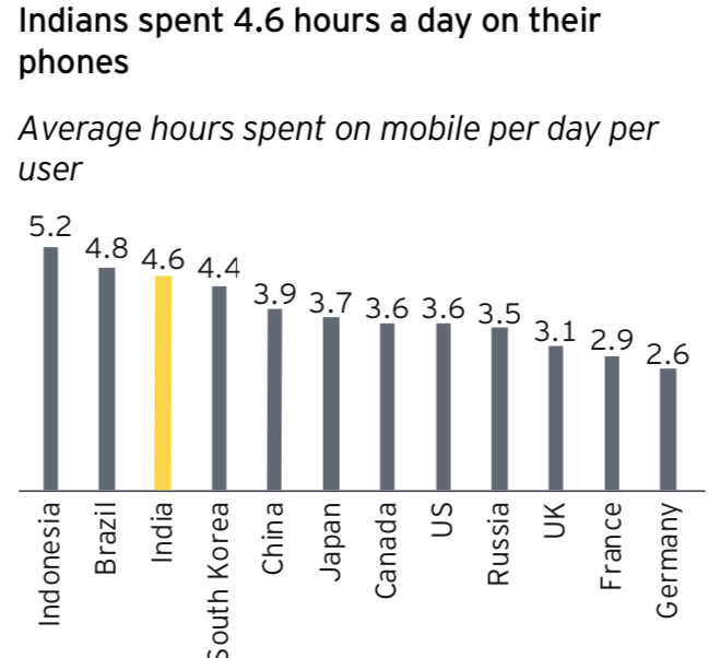 ► Indians spent 4.6 hours a day on their phones, increased data consumption by 15% over 2019 and aggregated 450 million online entertainment consumers in 2020.
