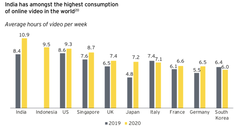 ► Viewers in India watch the most online video each week at an average of 10 hours 54 minutes, an increase of 30% from 2019.