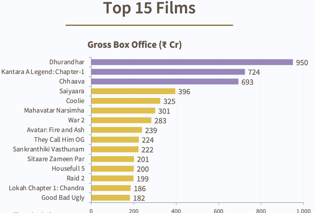 ‘Dhurandhar’, ‘Kantara A Legend: Chapter-1’ and ‘Chhaava’ were the only films to surpass the Rs. 500 crore mark at the India box office. ‘Saiyaara’, ‘Coolie’ and the multilingual animated film ‘Mahavatar Narsimha’ were the other three films to gross above Rs. 300 crore.